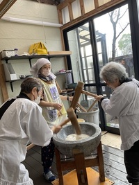 ついたお餅つきはみんなで丸め、お雑煮やきな粉もち、餡子もちに大根おろし餅などにして美味しく頂きました。